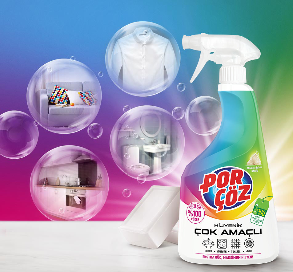 Op oppervlakken in de keuken en badkamer: Spuit Porçöz Multi Purpose Cleaner op het vuile oppervlak en veeg het vervolgens af met een vochtige doek of spons. Spoel het oppervlak na het afnemen af met water. Laat het product bij hardnekkig vuil 2-3 minuten inwerken.